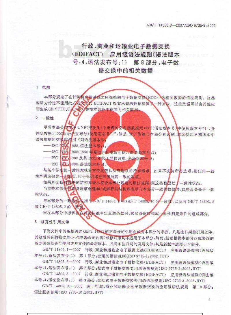 GB/T 14805.B—2007/ISO 9735-8:2002GB/T14805《行政、商业和运输业电子数据交换(EDIFACT)应用级语法规则(语法版术号:4,语法发布号:1)\由下列部分组成:第1部分:公用的语法规则,