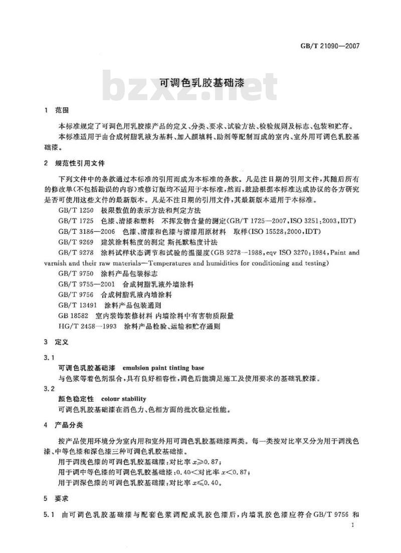 本标准规定了可调色用乳胶漆产品的定义、分类、要求、试验方法、检验规则及标志、包装和贮存。本标准适用于由合成树脂乳液为基料、加入颜填料、助剂等配制而成的室内、室外用可调色乳胶基础漆。 GB/T 21090-2007 可调色乳胶基础漆 GB/T21090-2007