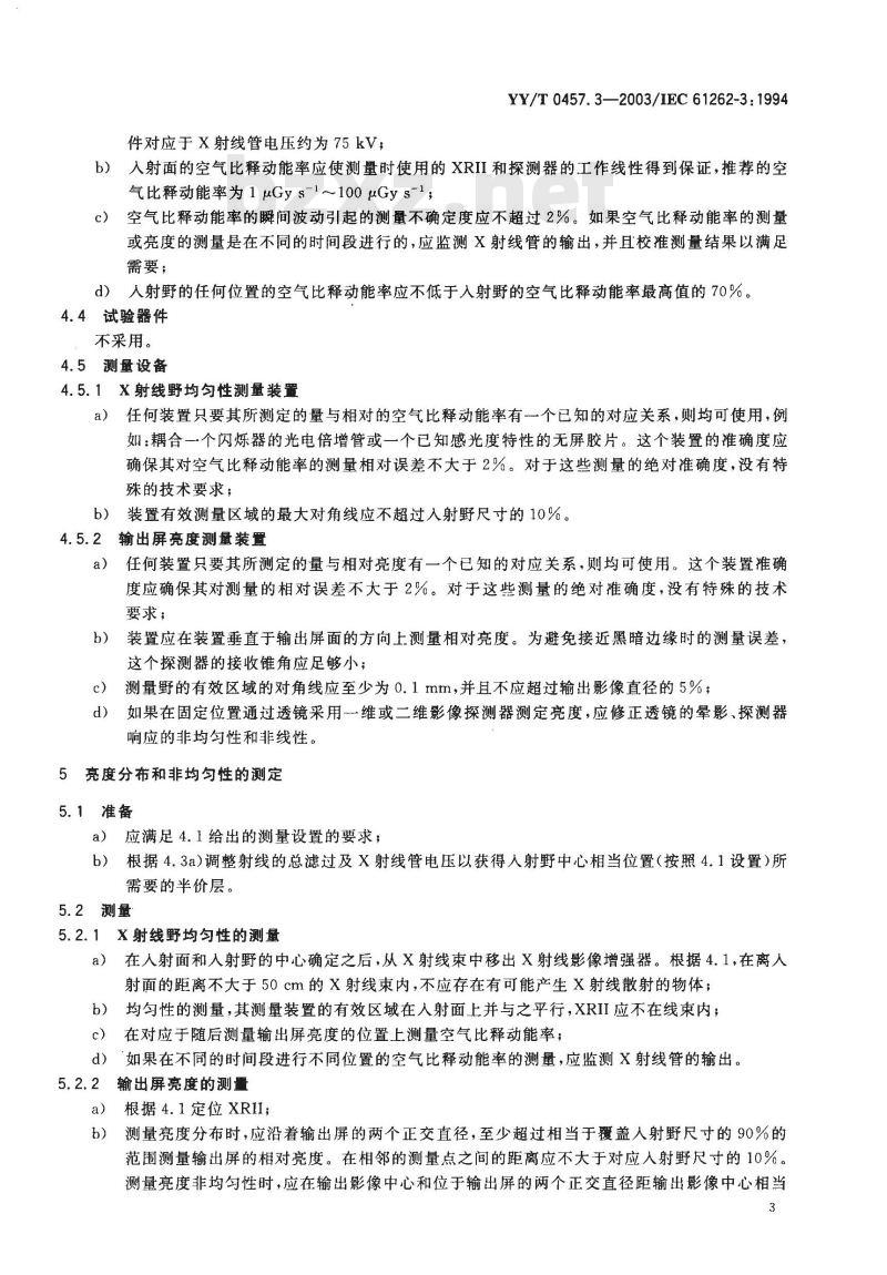 YY/T 0457. 3--2003/IEC 61262-3 : 1994于半径的90%的距离上的四个位置测量输出屏相对亮度,c)如果在不同的时闻段进行不同位置的亮度测量,应监测X射线管的输出,注:可以通过监测输出屏固定区域的亮度来监测X射线管的输出。d)修正X射线束非均勾性的相对亮度的测量值时,应确定人射面和输出影像的相对位置;e)应移出测量空气比释动能率的器件。5.3修正