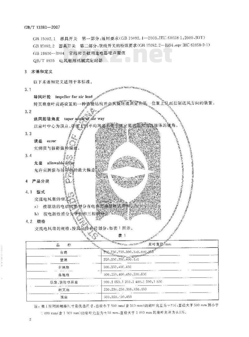 本标准适用下单相额定电压不超过250V,其他额定电压不超过480V,由交流电动机驱动的台扇,壁扇、台地扇、落地扇、吊扇、项扇、转页扇、杜式戚和装饰型吊扇及具调速器。本标推不适用于其他特殊条件下使用的电风扇。本标推所包含的电风扇和调速器的安全要求,应符GB4706.277家用和类似用途电器的安全风崩的特殊要求》的规定。