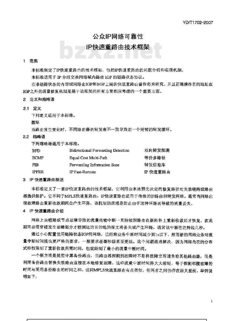 - YD/T 1702-2007 公众IP网络可靠性IP快速重路由技术框架
