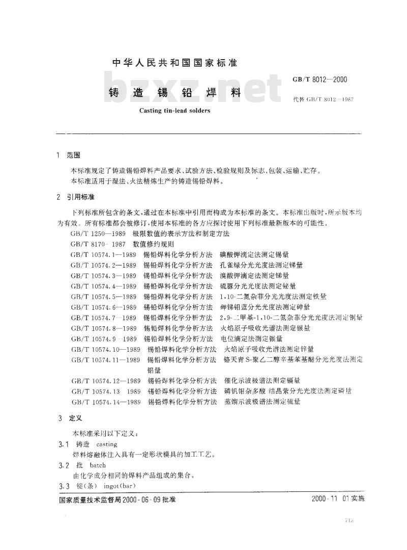 本标准自生效之日起·同时代替GB/T8012--1987《铸造锡铅焊料》。本标准由国家有色金属工业局提出。本标准由中国有色金属工业标准计量质量研究所归门。本标准由云南锡业公司起草。