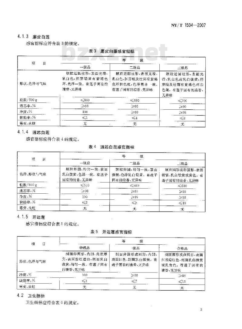 6.4.1感官指标检验结果均符合木标准要求时,则判定该批产品等级合格;检验结果有一个项目(除净度、霉变虫蛙外)不合格,若在下一级范围内仍判定该批产品等级格,若超出下一(一)级范围则判定该批产品等级不合格,降为下(二)等级.6.4.2卫生指标有一个项目不合格,则判定该批产品不介格。6.4.3理化指标有一个项目不符合要求,则判定该批产品不合格:有一个项日不符介要求.不判定为一级产品。
