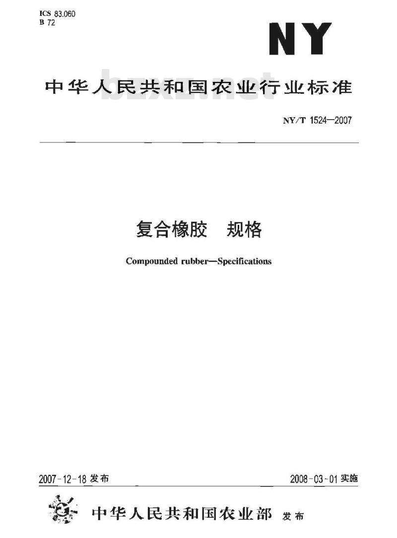 本标准规定了复合橡胶的术语和定义、品种、技术要求、试验方法、检验规则以及包装、标志、贮存和运输。 本标准适用于以天然橡胶为主要原料的国产和进口的复合橡胶。 NY/T 1524-2007 复合橡胶 规格 NY/T1524-2007