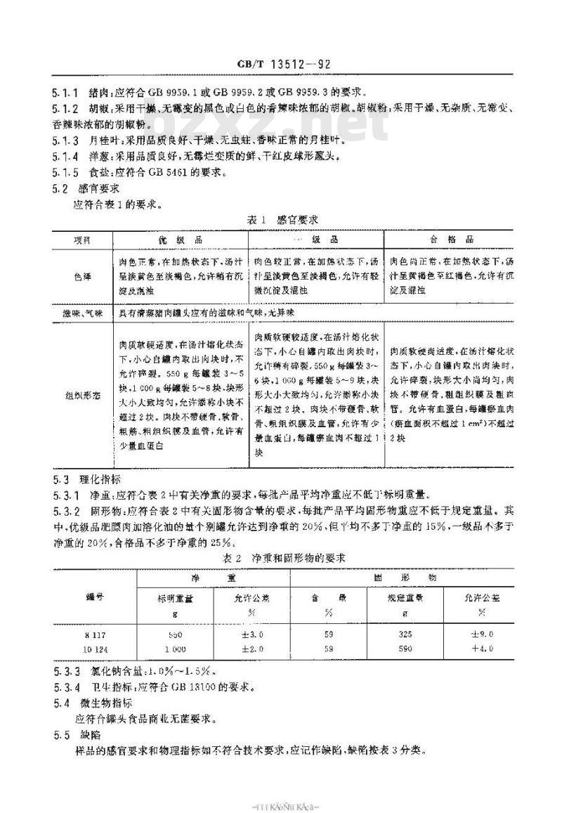 5.3.1净重:应符合表2中有关净重的要求,每批产品平均净重应不低了标明重量5.3.2周形物:应符合表2中有关固形物含量的要求.每批产品平均固形物重应不低于规定集量。其中,优级品肥膜肉加溶化油的盘个别罐充许达到净重的20%,但均不多丁净玉的15%,一级品不多于静重的20%,合格品不多于净重的25%。表2净重和固形物的要求