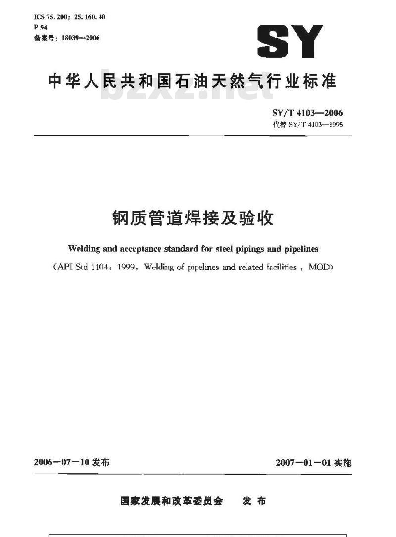 Welding and acceptance standard for steel pipings und pipelines(API Std 1104: 1999, Weldirng of pipelines and related facilities , MOD)2006—07—10 发布