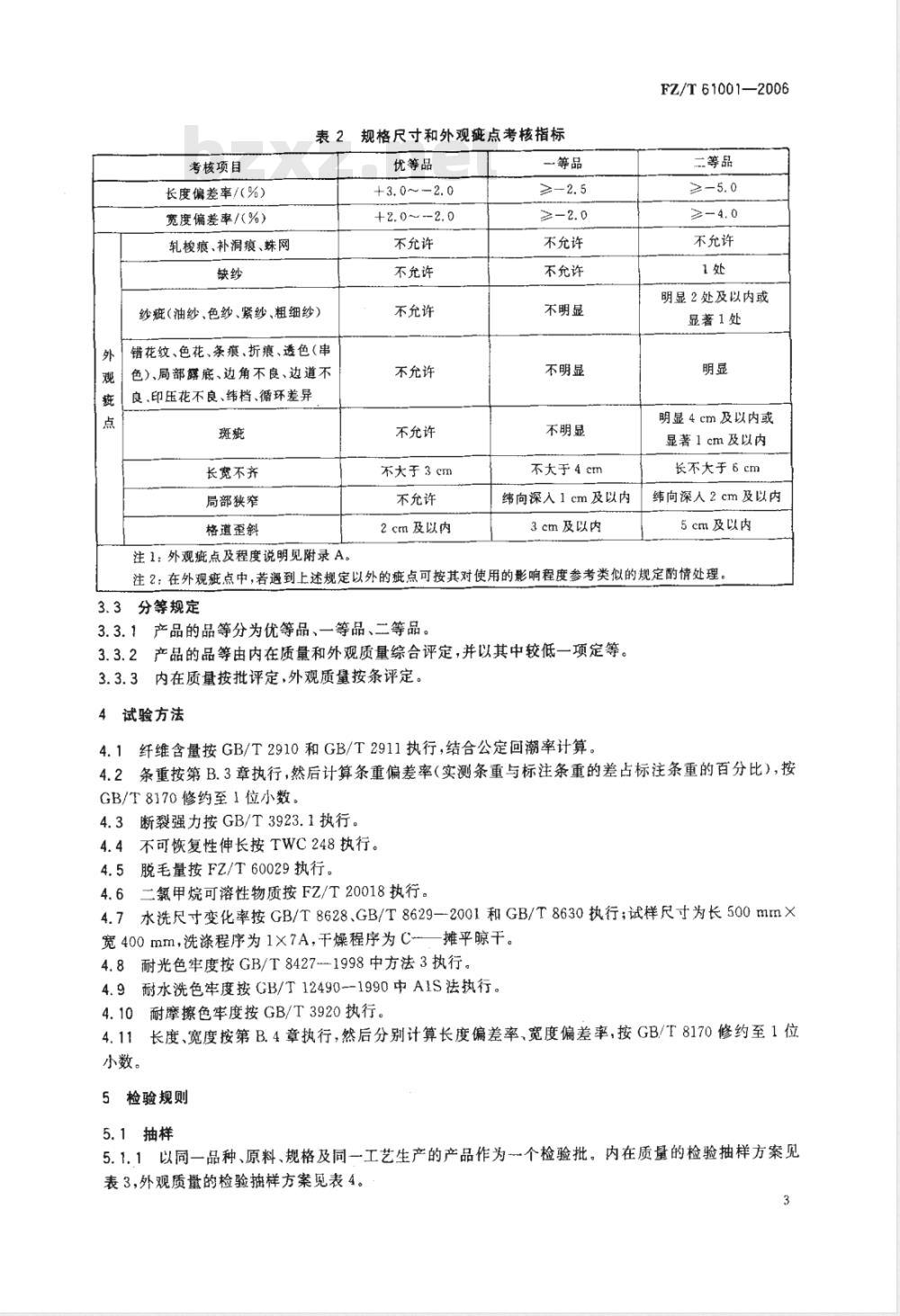 质量要求分为内在质量和外观质量。内在质量包括物理指标和染色牢度,外观质量包括实物质量、FZ/T61001—2006