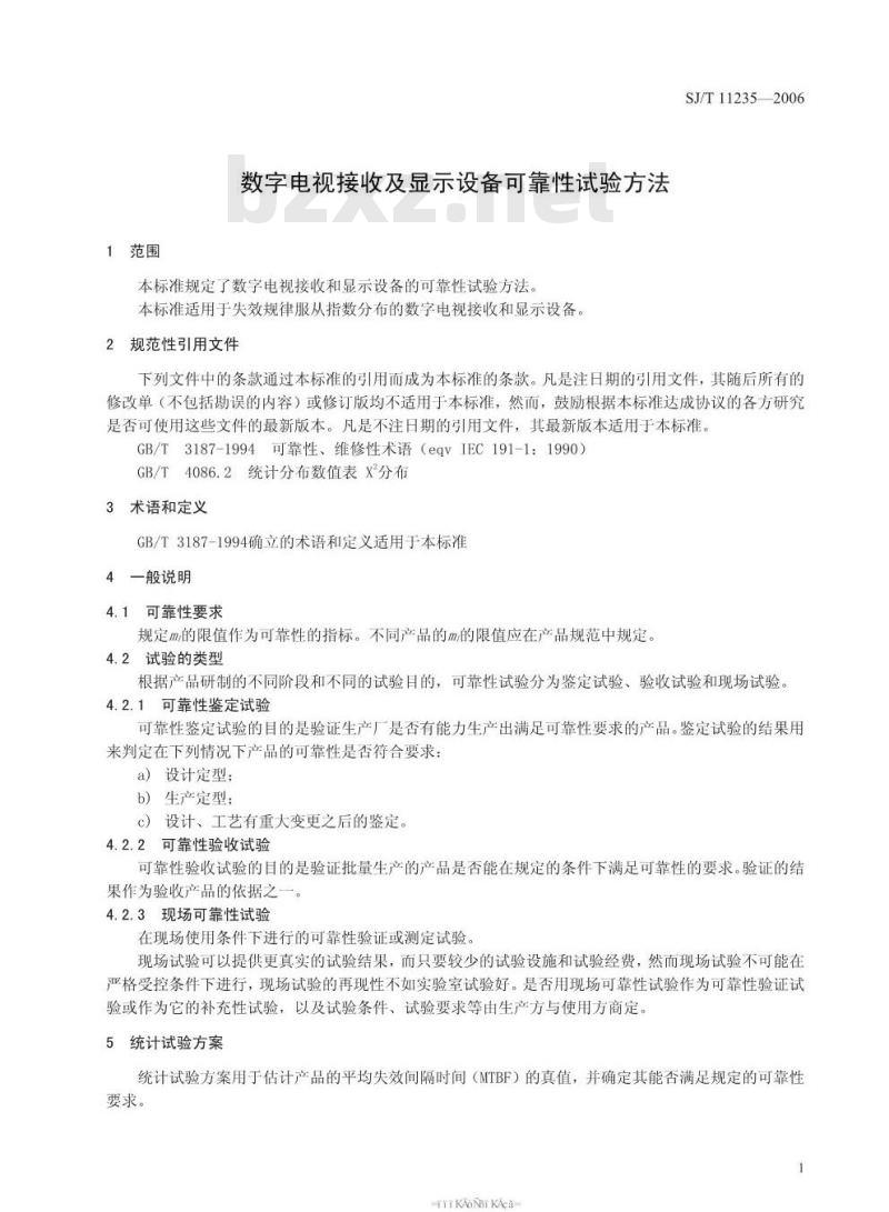 数字电视接收及显示设备可靠性试验方法本标准规定了数字电视接收和显示设备的可靠性试验方法。本标准适用于失效规律服从指数分布的数字电视接收和显示设备2规范性引用文件