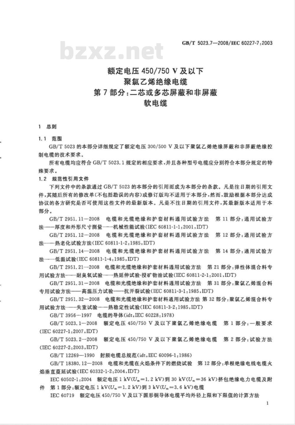 GB/T5023.7—2008/IEC60227-7:2003额定电压450/750V及以下