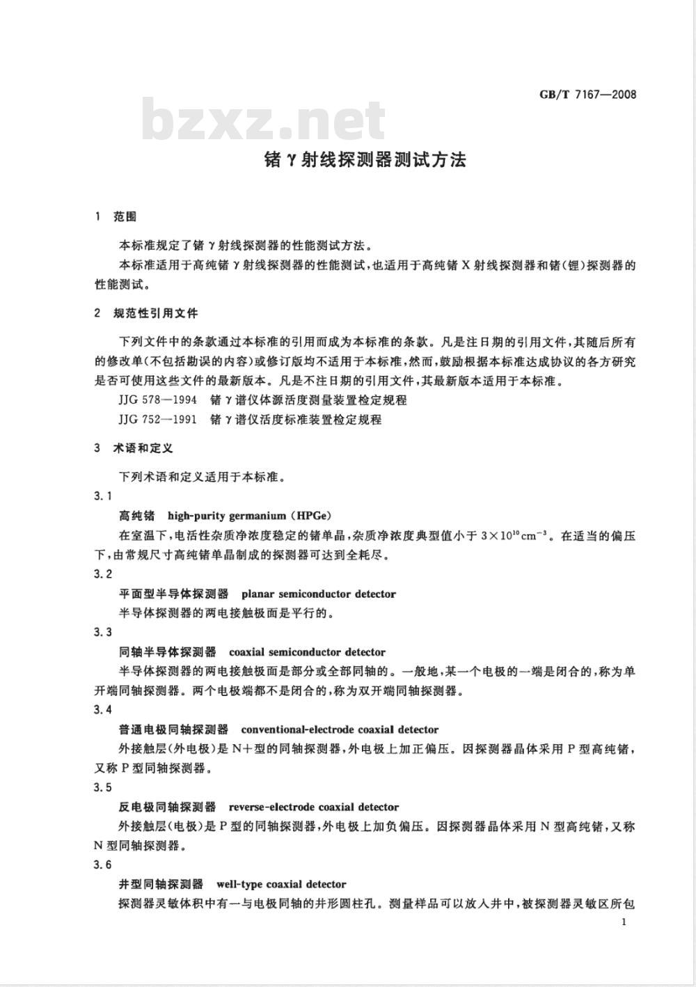 本标准代替GB/T7167—1996《锗射线探测器测试方法》。本标准与GB/T7167-1996相比主要变化如下:修改了术语和定义中能量分辨力和探测器窗厚度等部分(见本标准3.16、3.17、3.25);删除了锗探测器分类部分(见原标准第3章);一修改了探测效率部分(见本标准第6章)。本标准由中国核工业集团公司提出。本标准由全国核仪器仪表标准化技术委员会归口。本标准起草单位:中国原子能科学研究院。本标准主要起草人:袁大庆,魏可新。本标准所代替标准的历次版本发布情况为:GB/T7167-—1987、GB/T7167-1996。I