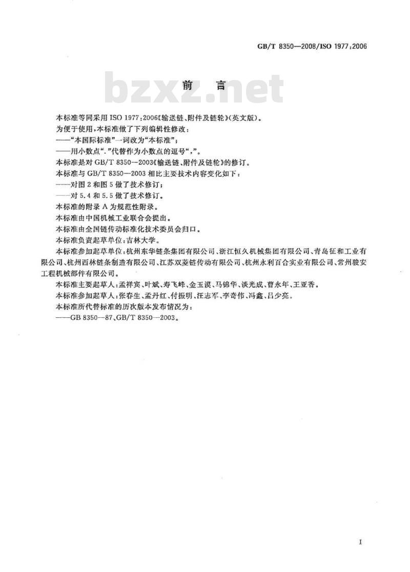 本标准等同采用ISO1977:2006《输送链、附件及链轮》(英文版)。为便于使用,本标准做了下列编辑性修改:“本国际标准”一词改为“本标准”;用小数点“”代替作为小数点的号“,”。本标准是对GB/T8350--2003《输送链、附件及链轮》的修订。本标准与GB/T8350—2003相比主要技术内容变化如下:对图2和图5做了技术修订;