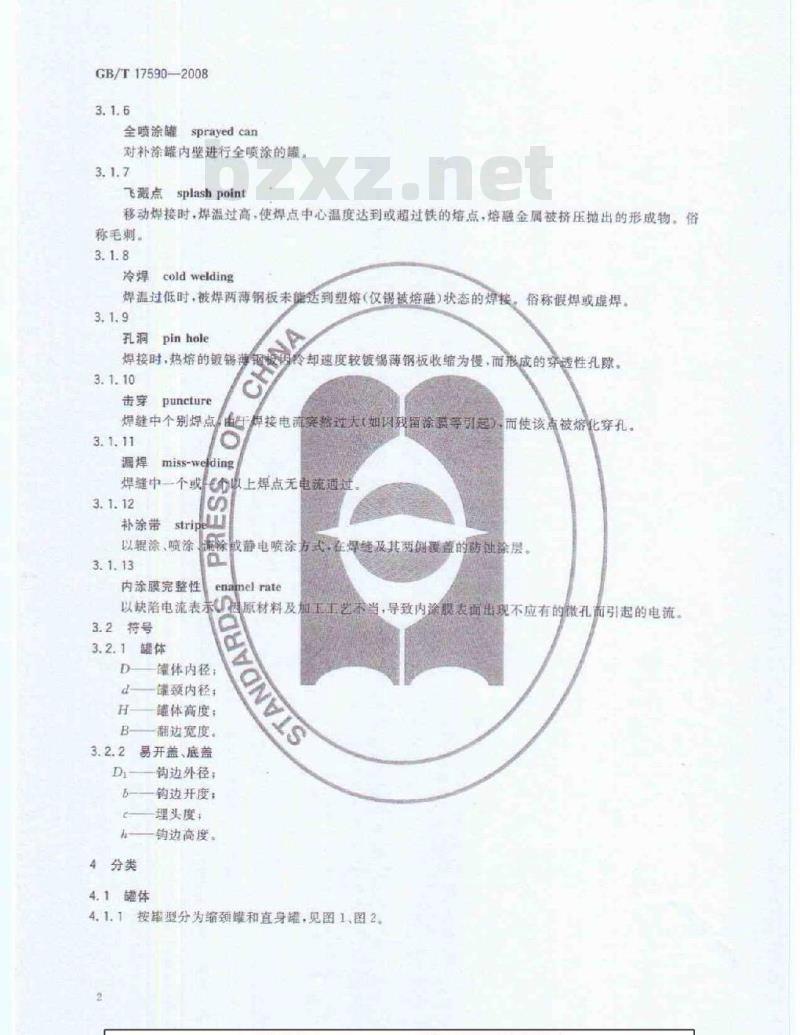 本标准代替GB/T17590—1998《易开盖三片罐》。本标准规定了铝易开盖三片罐的要求、试验方法、检验规则及标志、包装、运输、贮存。本标准适用于以镀锡(铬)薄钢板为原料用以灌装非充气饮料,经密封杀菌后达到商业无菌要求的铝易开盖三片罐的制造、使用、流通和监督检验。 本标准与GB/T17590—1998《易开盖三片罐》相比,主要变化如下:———明确适用范围为罐装非充气饮料;———删除镀锡(铬)薄钢板易开盖的相关内容;———对引用文件进行更新调整;———增加铝易开盖三片罐、缩颈罐、直身罐、粉末补涂罐、液体补涂罐的定义,取消焊缝补涂罐的定义;———罐体增加按补涂形式和喷涂方式的分类;———增加3个罐体规格和1个铝易开盖规格,并规定了主要尺寸和偏差要求;———对铝易开盖启破力和全开力的下限值稍有调整;———印刷质量要求执行QB/T1877的规定;———删除内外涂膜性能中有关涂膜量的相关内容;内外涂膜的固化性能的试验温度按杀菌工艺要求确定,常压杀菌100 ℃、高压杀菌121 ℃;———铝易开盖、底盖的密封胶干膜质量要求按密封胶干胶密度为1.3mg/mm3 进行调整;———铝易开盖、底盖耐压强度和密封性能要求压强试验值提高到180kPa;———增加卫生要求;———规定了开启可靠性的试验条件。 GB/T 17590-2008 铝易开盖三片罐 GB/T17590-2008
