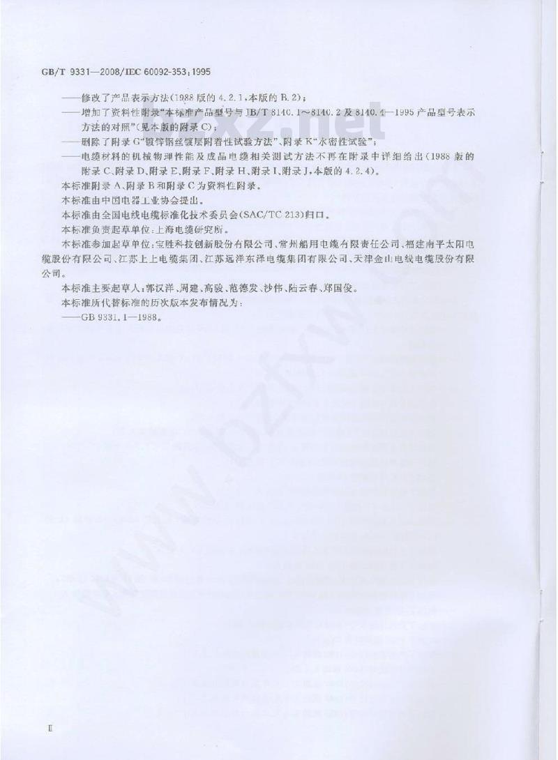 修改了产品系列代号(1988版的4.1.1.本版的附录B.1.1)取消了导体代号(1988版的4.1.2):修改了绝缘系列代号(1988版的4.1.3,本版的附录B.1.2):修改了护套系列代号(1988版的4.1.4,本版的附录B.1.3);修改了燃烧特性符号(1988版的4.1.5,本版的附录B.1.4);GB/T9331-2008/IEC60092-353.1995修改了产品表示方法(1988版的4.2.1,本版的B.2);增加了资料性附录“本标准产品型号与JB/T8140.1~8140.2及8140.4—1995产品型号表示方法的对照”(见本版的附录C):型除了附录G“镀锌钢丝镀层附着性试验方法”附录K“水密性试验”电绩材料的机械物理性能及成品电缆相关测试方法不再在附录中详细给出(1988版的附录C、附录D、附录E、附录F、附录H、附录I、附录J,本版的4.2.4)。本标准附录A、附录B和附录C为资料性附录。本标准由中国电器工业协会提出。本标准由全国电线电缆标准化技术委员会(SAC/TC213)归口。本标准负责起草单位:上海电缆研究所。本标准参加起草单位:宝胜科技创新股份有限公司、常州船用电缆有限责任公司、福建南平太阳电缆股份有限公司·江苏上上电缆集团江苏远洋东泽电缆集团有限公司天津金山电线电缆股份有限公司。