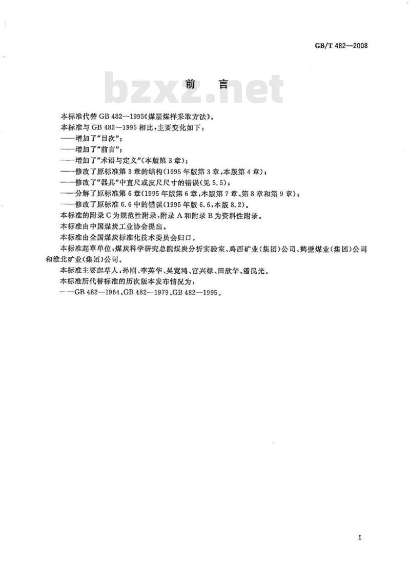 增加了“术语与定义”(本版第3章);修改了原标准第3章的结构(1995年版第3章,本版第4章);修改了“器具”中直尺或皮尺尺寸的错误(见5.5);分解了原标准第6章(1995年版第6章,本版第7章、第8章和第9章);修改了原标准6.6中的错误(1995年版6.6,本版8.2)。本标准的附录C为规范性附录,附录A和附录B为资料性附录本标准由中国煤炭工业协会提出。本标准由全国煤炭标准化技术委员会归口。GB/T482—2008