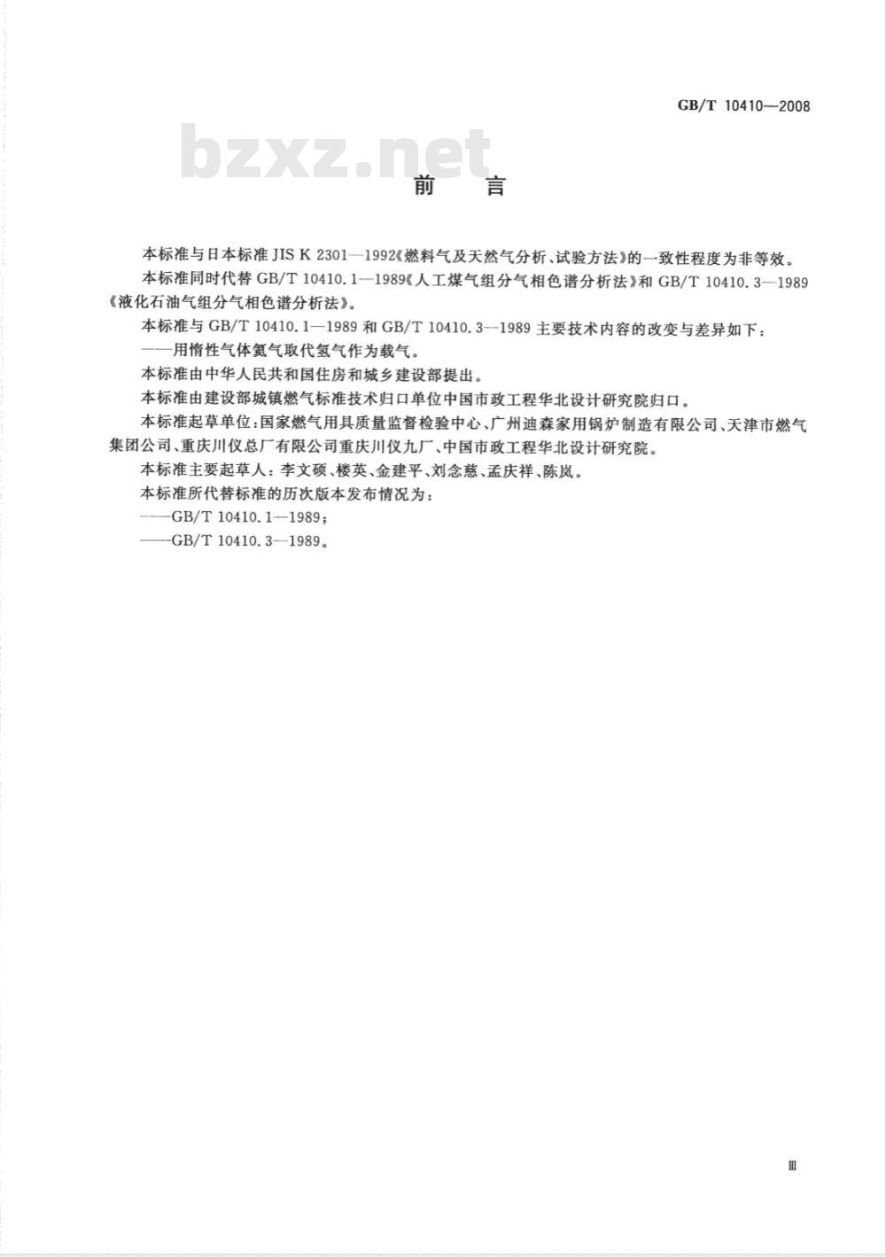 本标准与日本标准JISK2301--1992《燃料气及天然气分析、试验方法》的一致性程度为非等效。本标准同时代替GB/T10410.1—1989《人工煤气组分气相色谱分析法》和GB/T10410.3--1989《液化石油气组分气相色谱分析法》。本标准与GB/T10410.1—1989和GB/T10410.3--1989主要技术内容的改变与差异如下:用情性气体氮气取代氢气作为载气。本标准由中华人民共和国住房和城乡建设部提出。本标准由建设部城镇燃气标准技术归口单位中国市政工程华北设计研究院归口。本标准起草单位:国家燃气用具质量监督检验中心、广州迪森家用锅炉制造有限公司、天津市燃气集团公司、重庆川仪总厂有限公司重庆川仪九厂、中国市政工程华北设计研究院。本标准主要起草人:李文硕、楼英、金建平、刘念慈、孟庆祥、陈岚。本标准所代替标准的历次版本发布情况为:GB/T10410.1—1989;