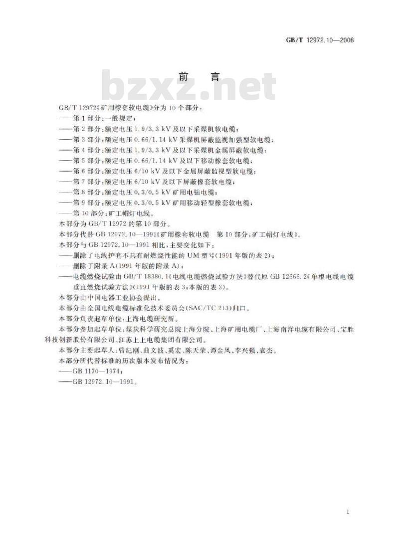 本部分代替GB12972.10—1991《矿用橡套软电缆第10部分:矿工帽灯电线》。本部分与GB12972.10—1991相比,主要变化如下删除了电线护套不具有耐燃烧性能的UM型号(1991年版的表2):删除了附录A(1991年版的附录A):电缆燃烧试验由GB/T18380.1电线电缆燃烧试验方法》替代原GB12666.2《单根电线电缆垂直燃烧试验方法》(1991年版的表3:本版的表3)。本部分由中国电器工业协会提出。本部分由全国电线电缆标准化技术委员会(SAC/TC213)归口。本部分负责起草单位:上海电缆研究所。本部分参加起草单位:煤炭科学研究总院上海分院上海矿用电缆厂,上海南洋电缆有限公司,宝胜科技创新股份有限公司、江苏上土电缆集团有限公司。本部分主要起草人:曾纪刚、曲文波、英宏、陈天荣、谭金风、李兴强、袁杰。本部分所代替标准的历次版本发布情况为:GB11701974: