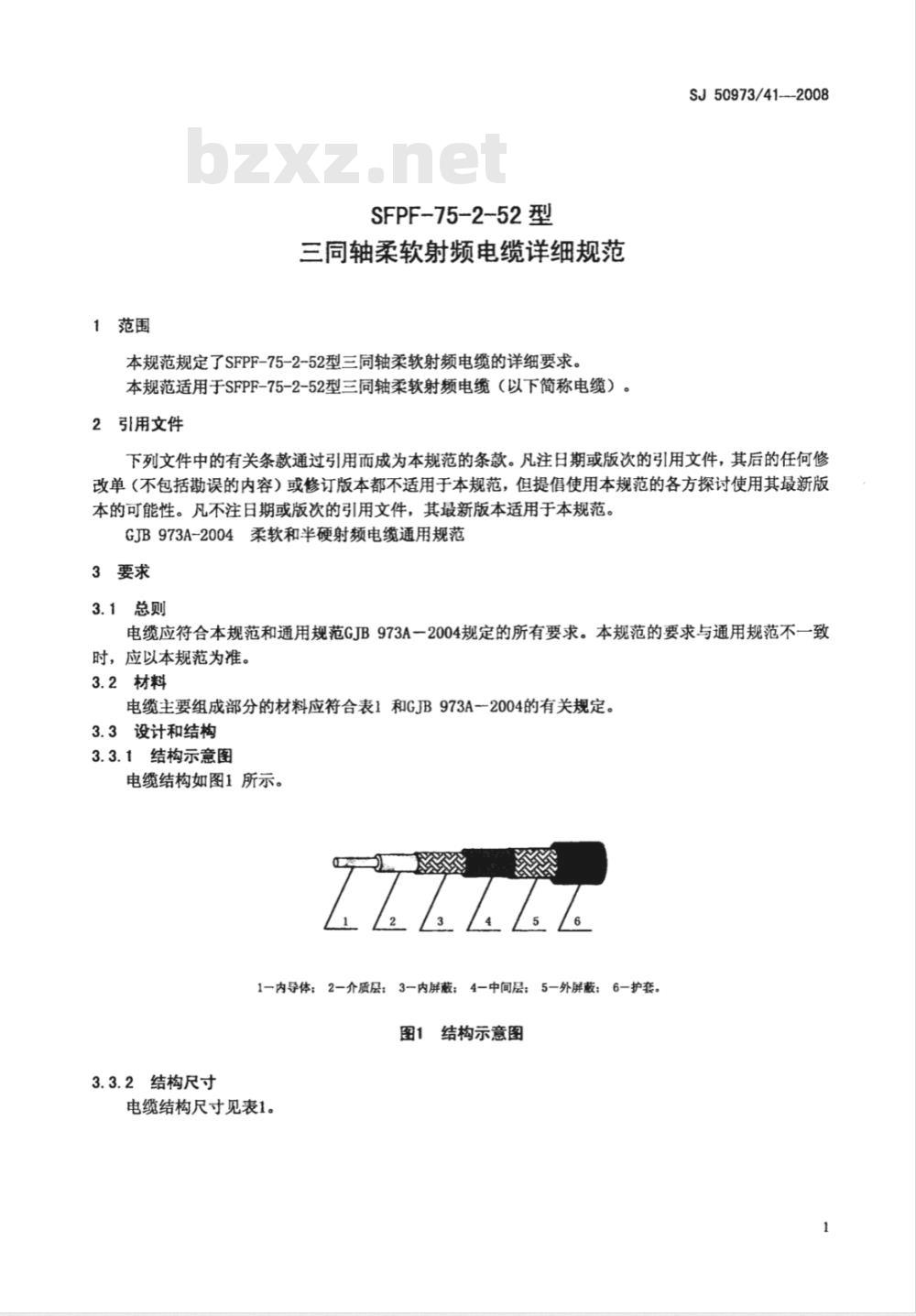 本规范规定了SFPF-75-2-52型三同轴柔软射频电缆的详细要求。本规范适用于SFPF-75-2-52型三同轴柔软射频电缆(以下简称电缆)。2引用文件