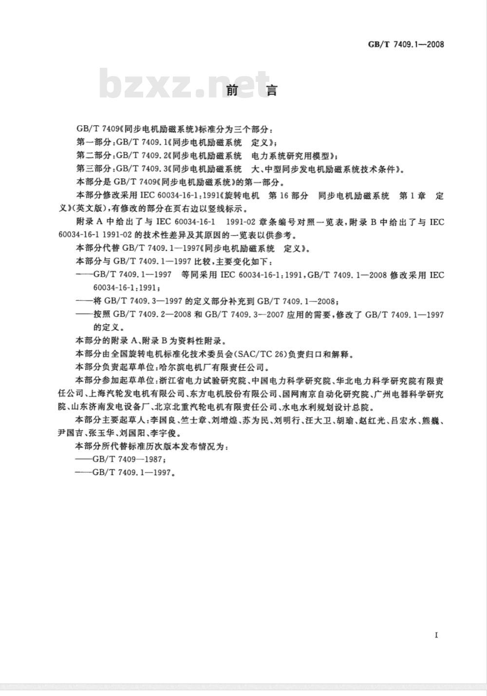义》(英文版),有修改的部分在页右边以竖线标示。附录A中给出了与IEC60034-16-11991-02章条编号对照一览表,附录B中给出了与IEC60034-16-11991-02的技术性差异及其原因的一览表以供参考。本部分代替GB/T7409.1—1997《同步电机励磁系统定义》。本部分与GB/T7409.1一1997比较,主要变化如下:GB/T7409.1-1997等同采用IEC60034-16-1:1991,GB/T7409.1—2008修改采用IEC60034-16-1:1991;