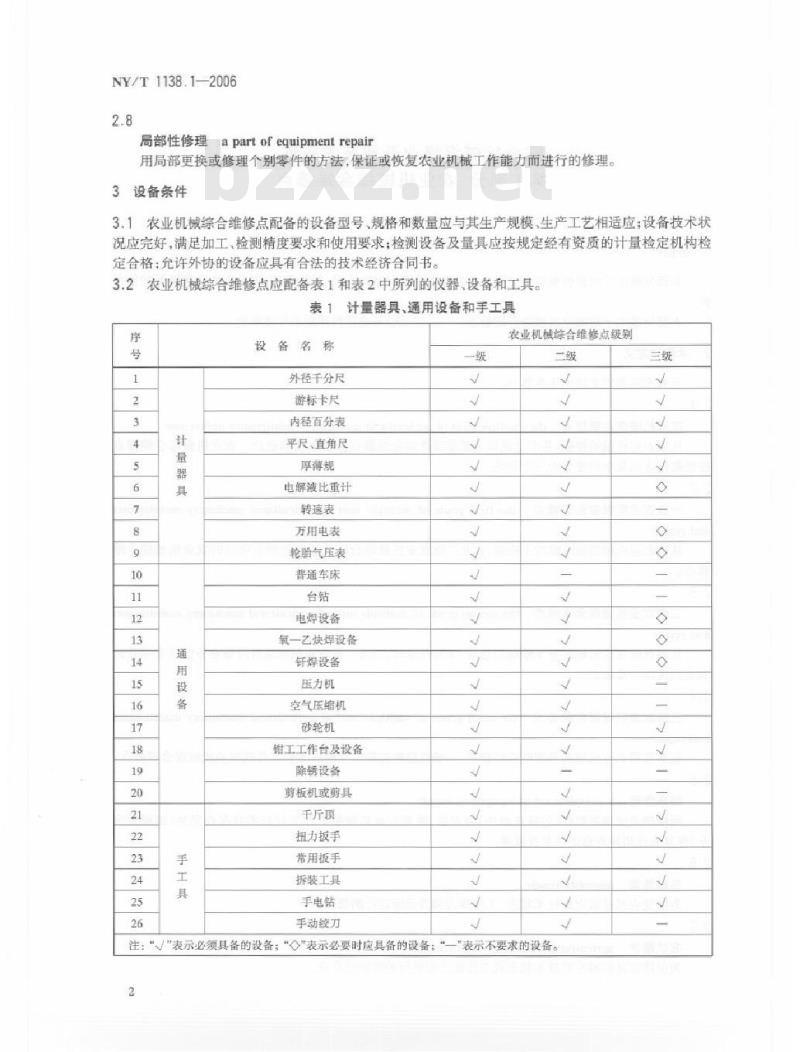 3.1农业机械综合维修点配备的设备型号、规格和数量应与其生产规模、生产工艺相适应:设备技术状况应完好,满足加工、检测精度要求和使用要求;检测设备及量具应按规定经有资质的计量检定机构检定合格;允许外协的设备应其有合法的技术经济合同书。农业机械综合维修点应配备表1和表2中所列的仪器、设备和工具3.2