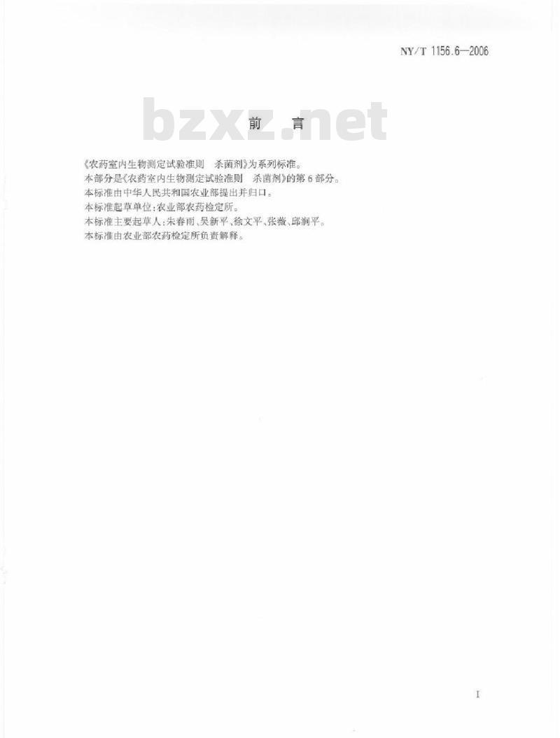 《农药室内生物测定试验准则杀菌剂》为系列标准。本部分是《农药室内生物测定试验准则杀菌剂》的第6部分。本标准由中华人民共和国农业部提出并归口。本标准起草单位:农业部农药检定所。本标准主要起草人:朱春雨、吴新平、徐文平、张薇、邱涧平。本标准由农业部农药检定所负责解释。NY/T1156.6—2006