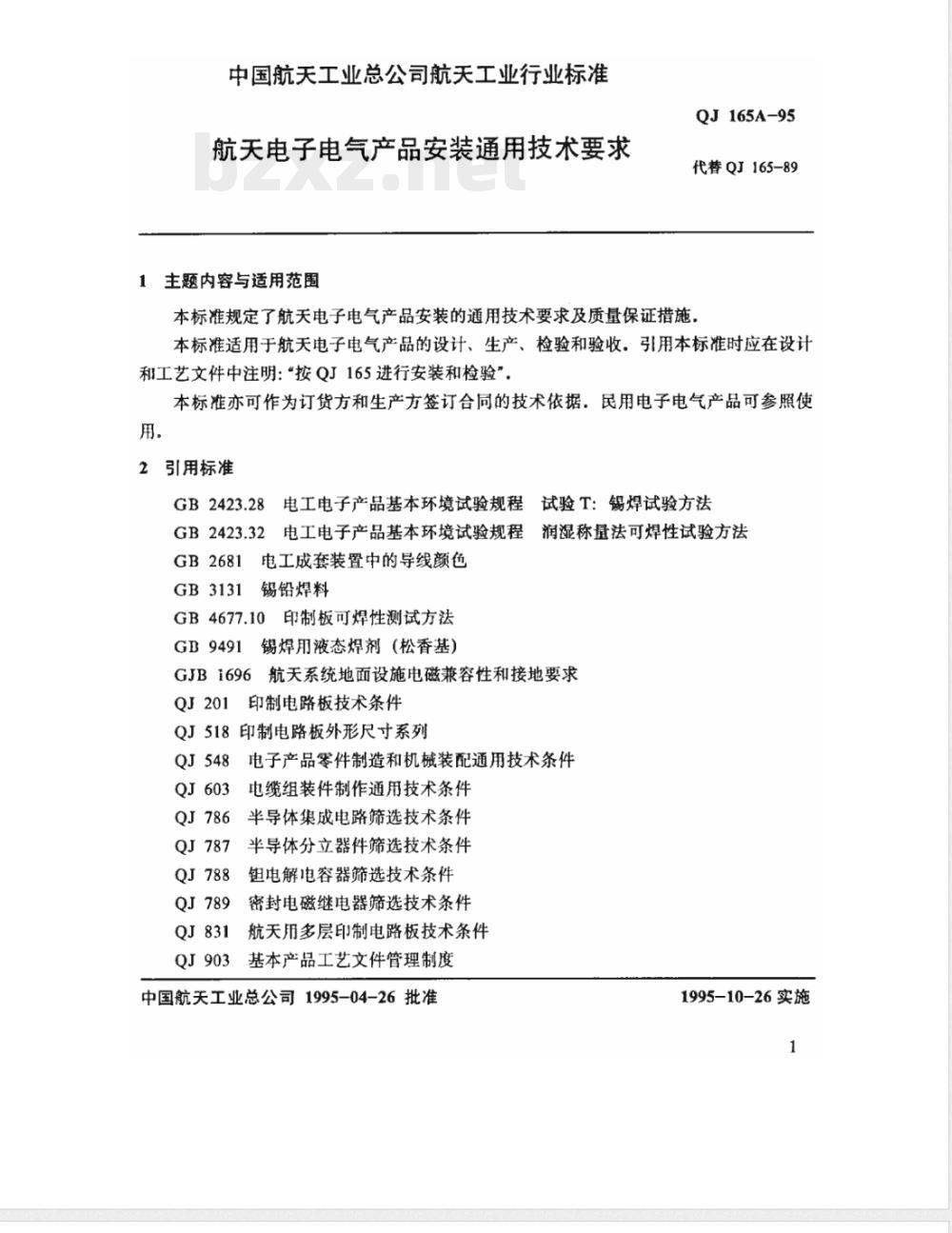 本标准规定了航天电子电气产品安装的通用技术要求及质量保证措施,本标准适用于航天电子电气产品的设计、生产、检验和验收.引用本标准时应在设计和工艺文件中注明:“按QJ165进行安装和检验\本标准亦可作为订货方和生产方签订合同的技术依据,民用电子电气产品可参照使用。