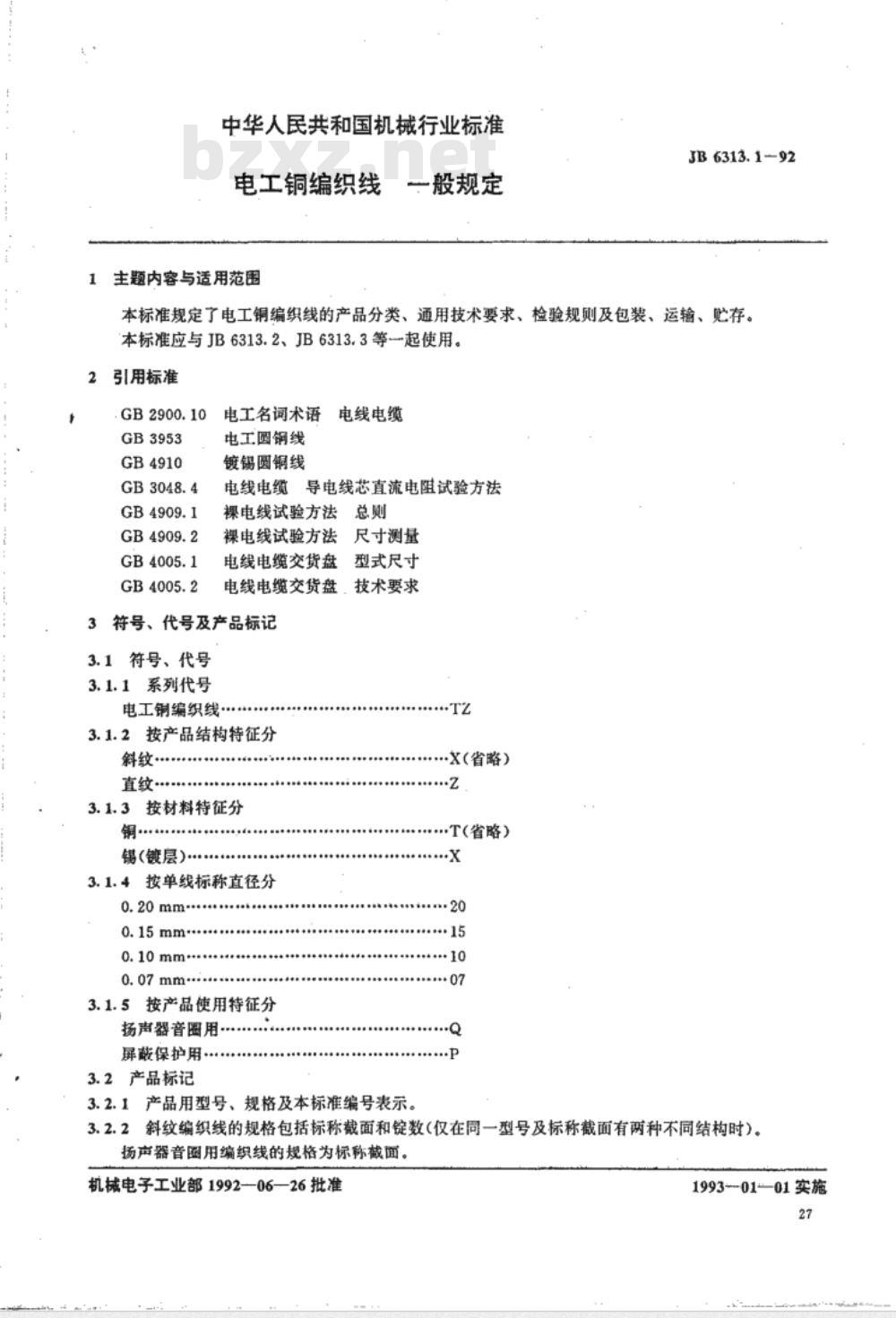 本标准规定了电工铜编织线的产品分类、通用技术要求、检验规则及包装、运输、贮存。本标准应与JB6313.2、JB6313.3等起使用。2引用标准