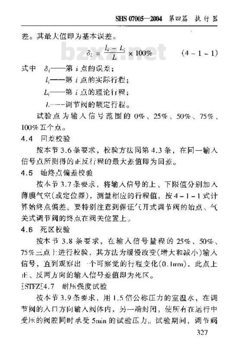 按本节3.7条要求,将输人信号的上、下限值分别加人薄膜气室【或定位器,测革树成的行程值,接4一1一1式计算始终点偏差。要特别注意到保证开式调节阀的始点、气关式调节阀的终点在阀关位置上:4.6死区校验