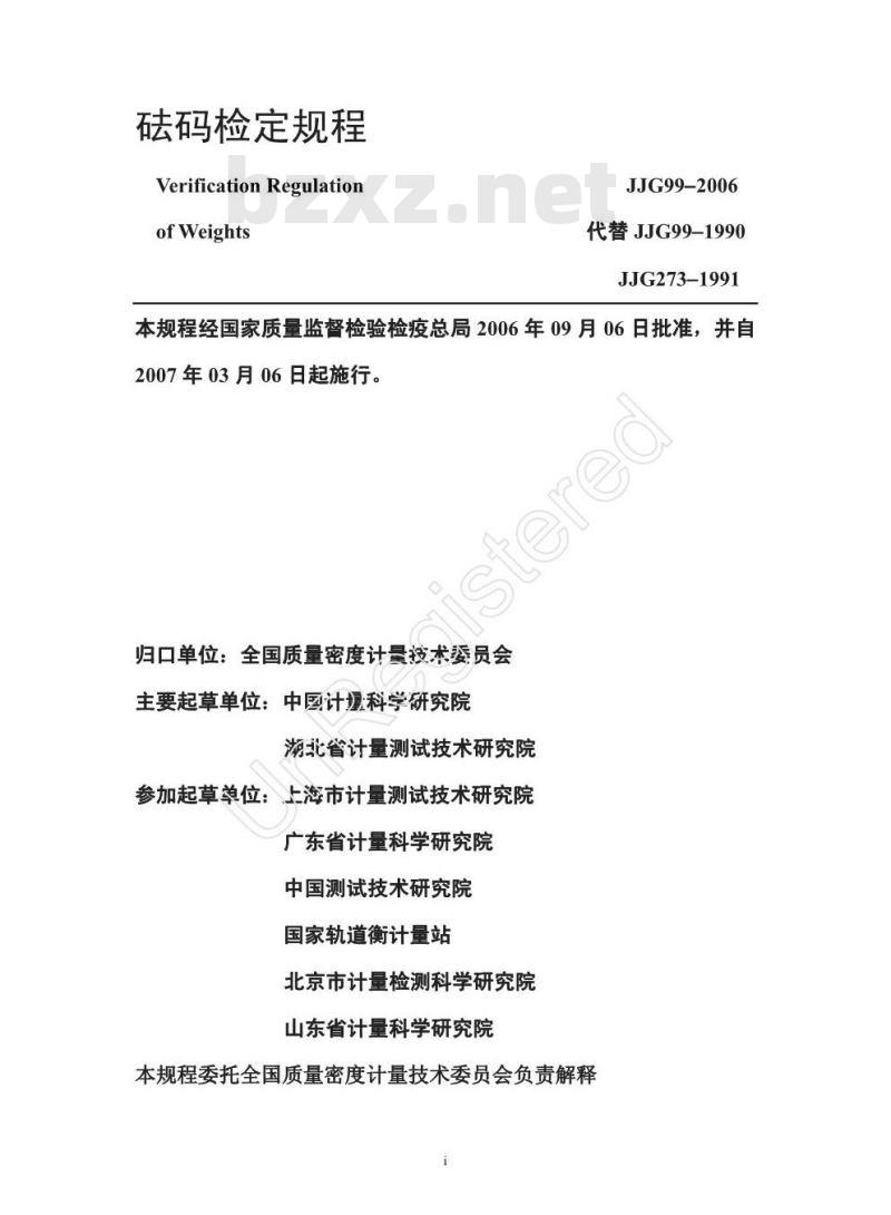 本规程适用于各种砝码的首次检定(修理后的检定视同首次检定,下同)、后续检定。 JJG 99-2006 砝码检定规程 JJG99-2006