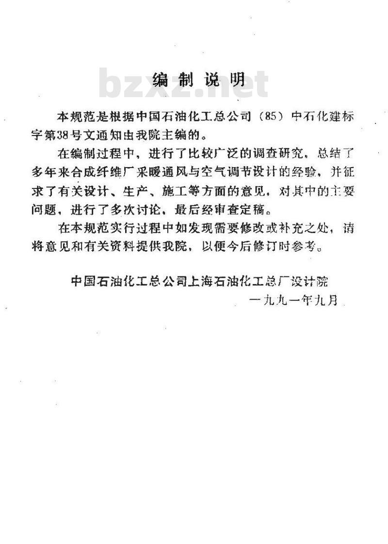 本规范是根据中国石油化工总公司(85)中石化建标学第38号文通知由我院主编的。在编制过程中,讲行了比较广泛的调查研究,总结了多年来合成纤维厂采暖通风与空气调节设计的经验,并征求了有关设计、生产、施工等方面的意见,对其中的主要问题,进行了多次讨论,最后经审查定稿。在本规范实行过程中如发现需要修改或补充之处,请将意见和有关资料提供我院,以便今后修订时参考,中国石油化工总公司上海石油化工总广设计院一九九一年九月