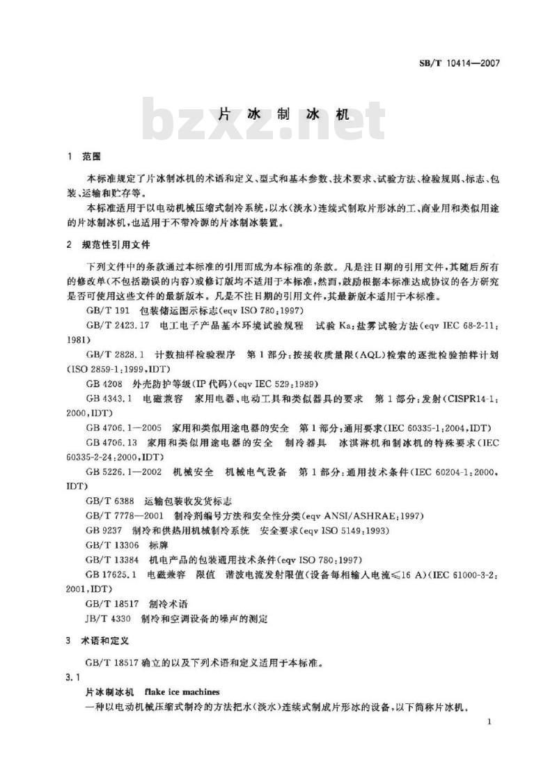 本标准适用于以电动机械压缩式制冷系统,以水(淡水)连续式制取片形冰的工、商业用和类似用途的片冰制冰机,也适用于不带冷源的片冰制冰装置。2规范性引用文件
