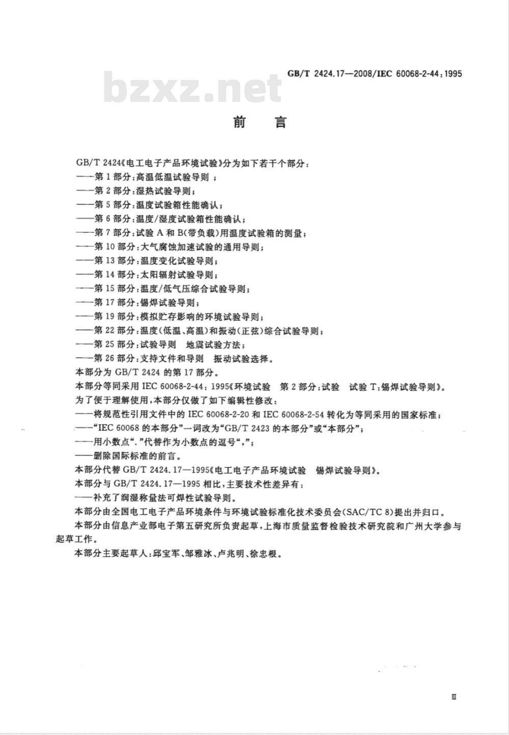 第19部分:模拟贮存影响的环境试验导则;-第22部分:温度(低温、高温)和振动(正弦)综合试验导则;第25部分:试验导则地震试验方法;一第26部分:支持文件和导则振动试验选择。本部分为GB/T2424的第17部分。本部分等同采用IEC60068-2-44:1995《环境试验第2部分:试验试验T:锡焊试验导则》。为了便于理解使用,本部分仅做了如下编辑性修改:-将规范性引用文件中的IEC60068-2-20和IEC60068-2-54转化为等同采用的国家标准;“IEC60068的本部分”一词改为“GB/T2423的本部分”或“本部分”;用小数点“,”代替作为小数点的逗号“,”;删除国际标准的前言。