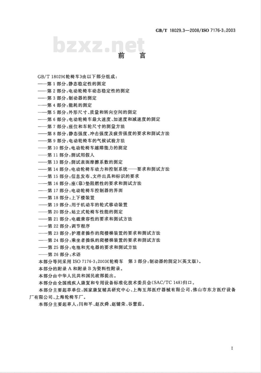 本部分等同采用IS07176-3:2003《轮椅车第3部分:制动器的测定》(英文版)。本部分的附录A和附录B为资料性附录。本部分由中华人民共和国民政部提出。本部分由全国残疾人康复和专用设备标准化技术委员会(SAC/TC148)归口。本部分主要起草单位:国家康复辅具研究中心、上海互邦医疗器械有限公司、佛山市东方医疗设备厂有限公司、上海轮椅车厂。