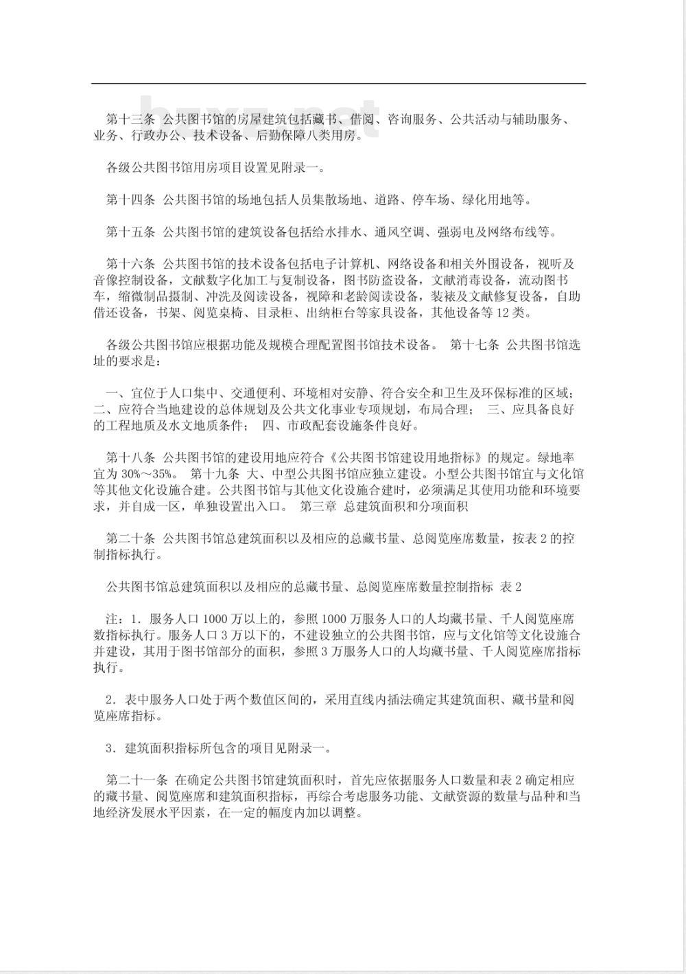 2.表中服务人口处于两个数值区间的,采用直线内插法确定其建筑面积、藏书量和阅览座席指标。