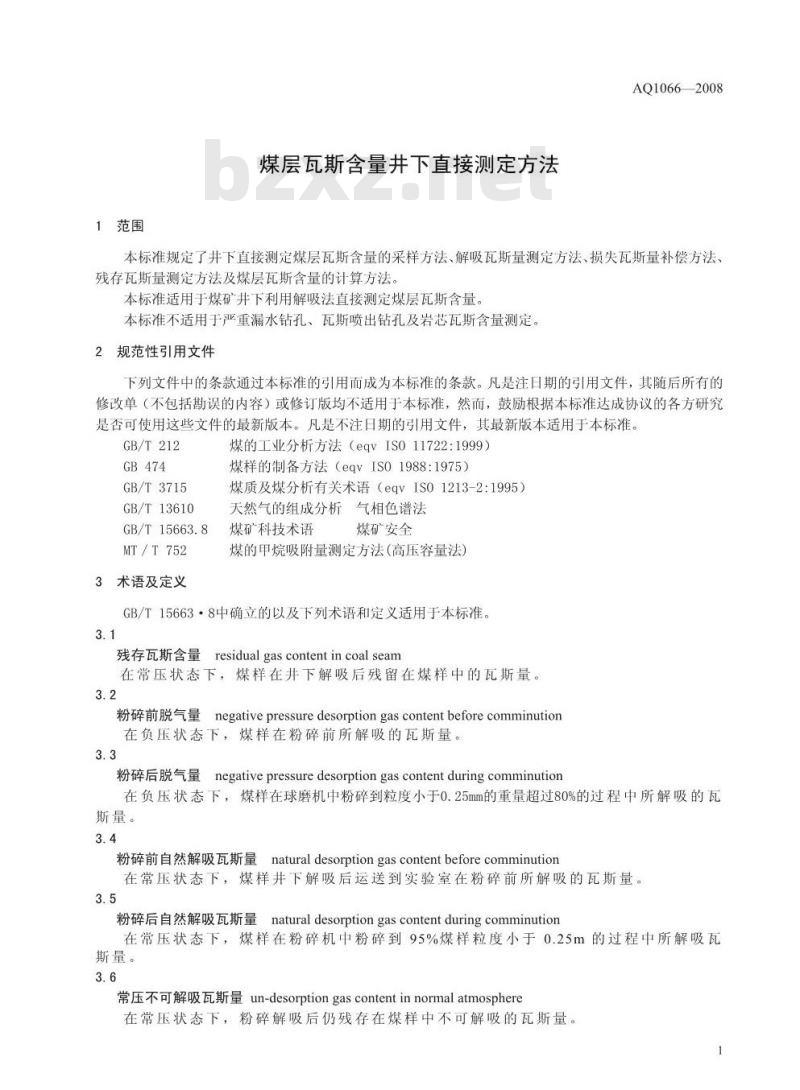 - AQ 1066-2008 煤层瓦斯含量井下直接测定方法