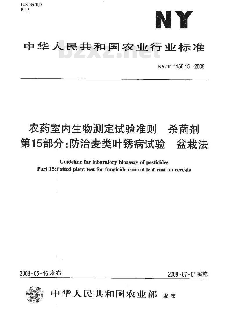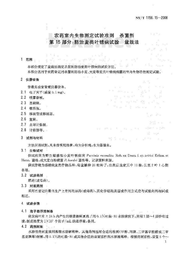 NY/T 1156.15-2008 农药室内生物测定试验准则 杀菌剂 第15部分:防治麦类叶锈病试验 盆栽法 NY/T1156.15-2008