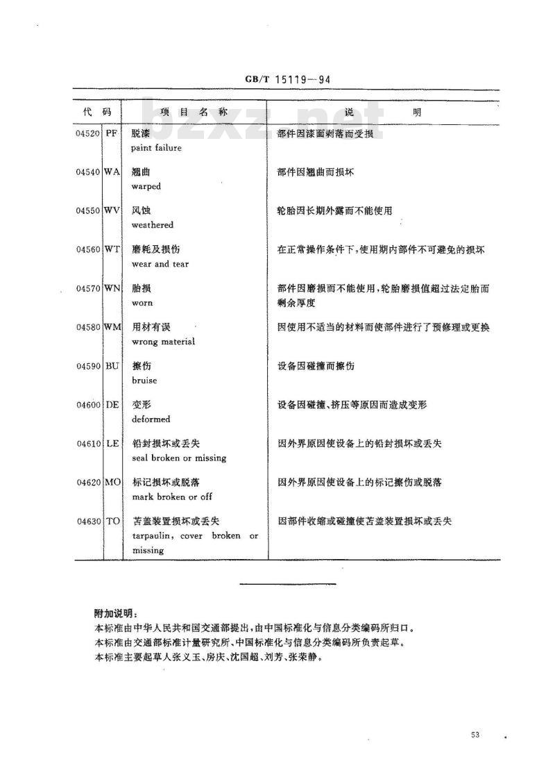 本标准规定了集装箱及设备的常用残损状态代码GB/T15119—94