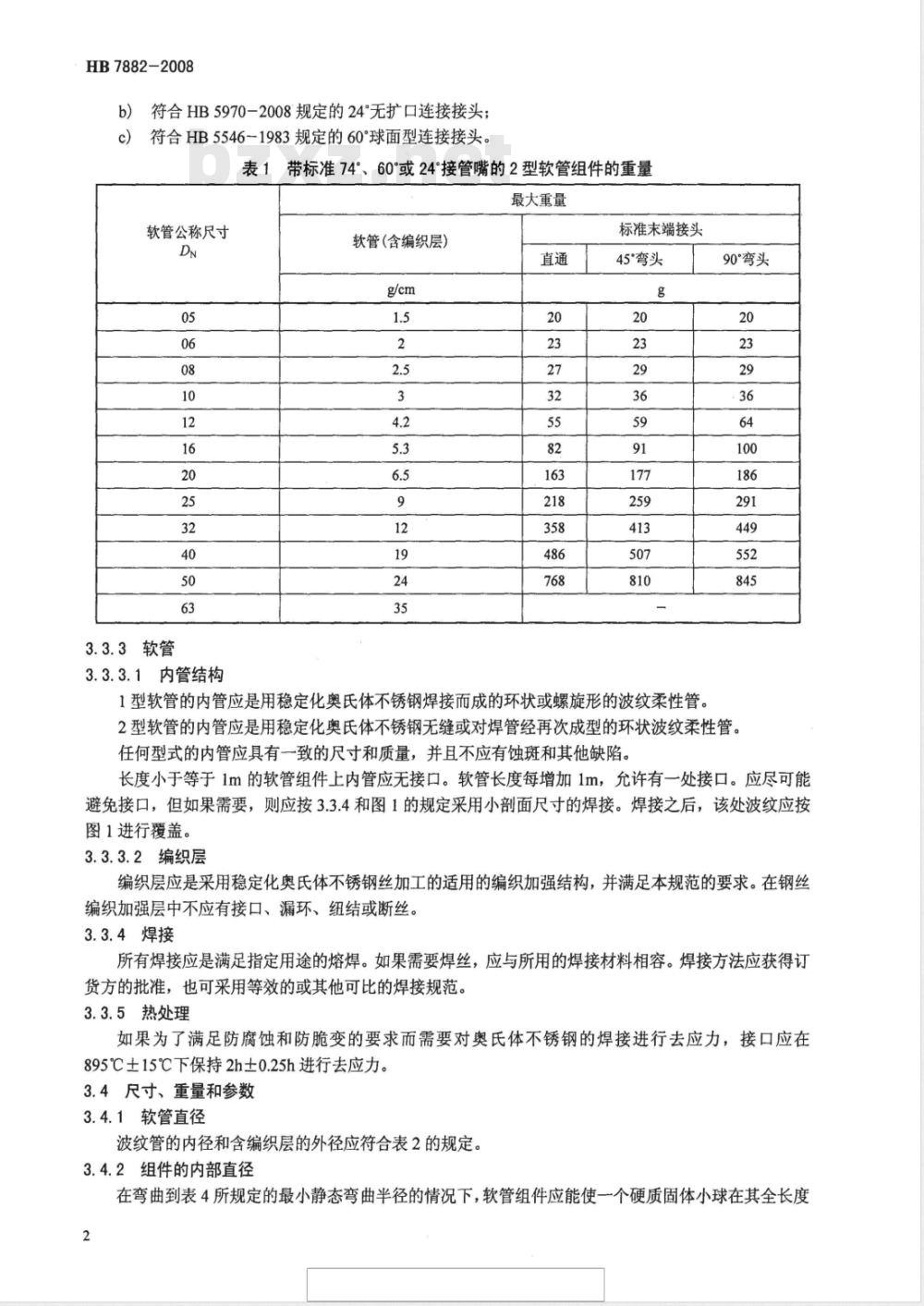 带有标准74°、24°或60°接管嘴的2型软管组件的最大重量应符合表1的规定。1型软管组件或带有其他形式接管嘴的2型软管组件的最大重量应符合经订货方批准的相应图样的规定。3.5性能