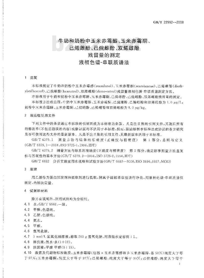 本标雅规定了4奶和奶粉玉米苯霉醇(zearalanol)、下米赤霉酮(zearakanone)、已烯耀酚(diethylstillhestrol)、凹烷雌酚(hexesttul)、双烯雌酚(dicno-cstrol)残留量液相色谱串联质溃测定方法。本标谁用于牛奶和奶粉中玉米赤醇、程米赤霉酮、己烯硼酸、巴烷雌酚.双烯雌酚残留鼠的测定,本标准方法检出限:奶中飞米赤霉醇、玉米赤霉、已烷雄酚、已烯雄酚和双烯雄翻为1.0g/.;奶粉中卡米亦露醇、玉米赤霉酬酮.已烷焰酚已烯雌骑和双烯雌为8.0g/kg:2规范性引用文件