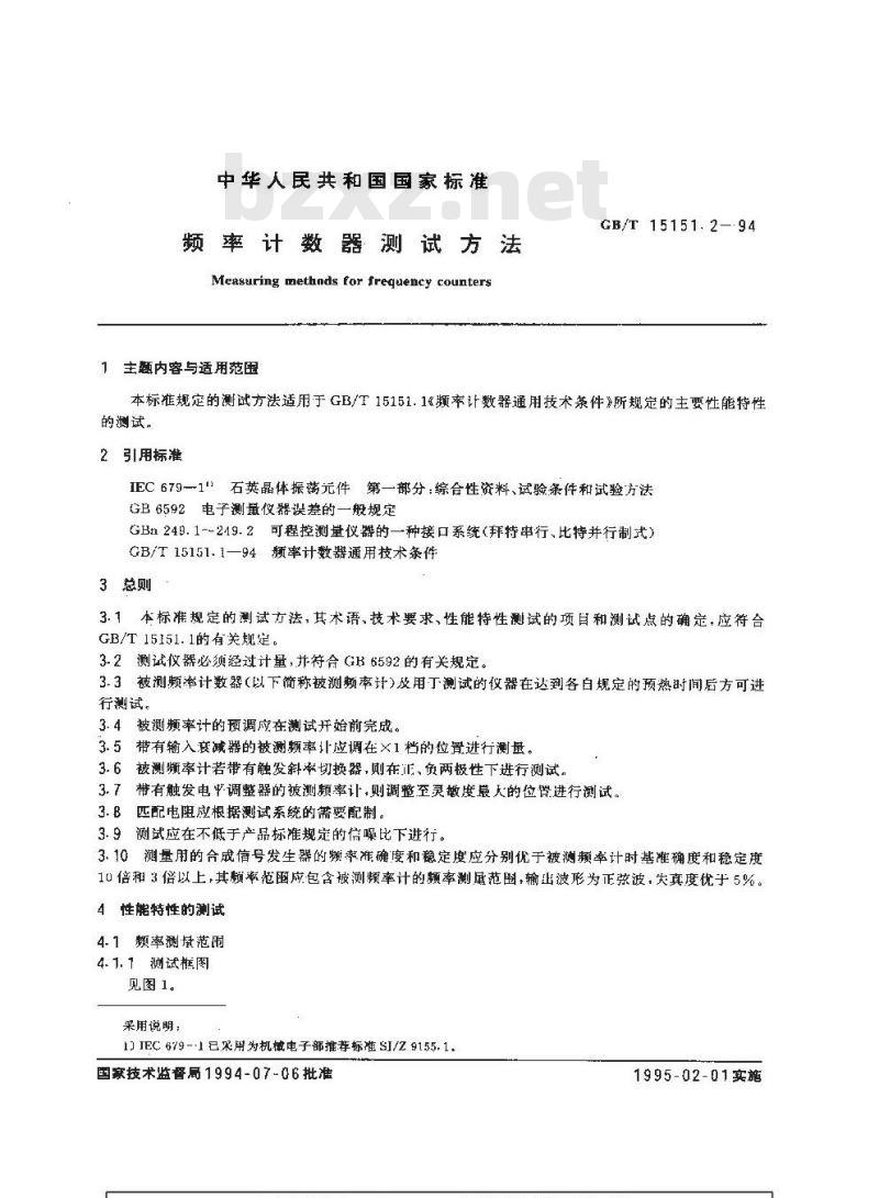 本标准规定的测试方法适用于GB/T 15151.1《频率计数器通用技术条件》所规定的主要性能特性的测试。本标准规定的测试方法,其术语、技术要求、性能特性测试的项目和测试点的确定,应符合GB/T 15151.1的有关规定。 GB/T 15151.2-1994 频率计数器测试方法 GB/T15151.2-1994