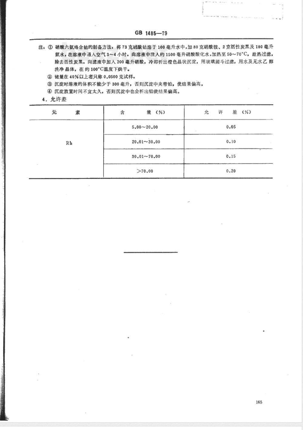 注,①硝酸六氨络合钻的制备方法,将73克硝酸钻溶于100毫升水中,加80克硝酸铵、2克活性炭黑及180毫升氨水,在溶液中通入空气3~4小时。向溶液中注入约1500毫升硝酸酸化水,加热至50~70°C,趁热过滤,除去活性炭黑。向滤液中加人200毫升硝酸,冷却析出橙色晶状沉淀,用玻璃漏斗过滤,用水及无水乙醇洗净晶体,在约100°C温度下烘干。②佬量在40%以上者只称0.0500克试样。③沉淀时溶液的体积不能少于300毫升,否则沉淀中夹带铂,使结果偏高。④沉淀放置时间不宜太久,否则沉淀中也会析出铂使结果偏高。4允许差