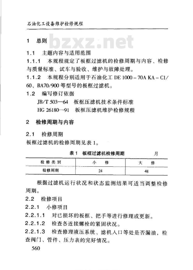 本规程规定了板框过滤机的检修周期与内容、检修与质量标准、试车与验收、维护与故障处理。1.1.2本规程分别适用于石油化工DE1000-70AKA-C1/60、BA70/900等型号的板框过滤机。1.2