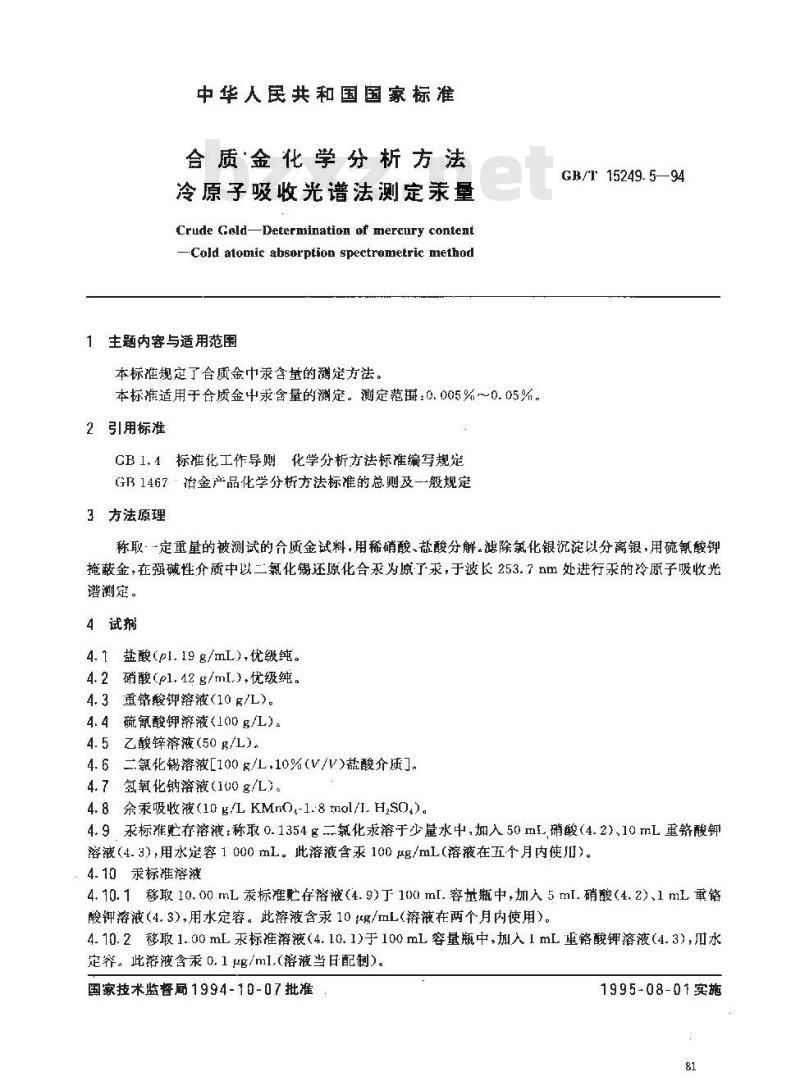 - GB/T 15249.5-1994 合质金化学分析方法 冷原子吸收光谱法测定汞量