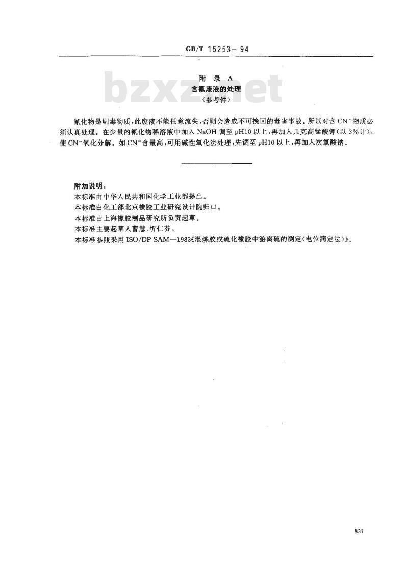 本标准由中华人民共和国化学工业部提出。本标准由化工部北京橡胶工业研究设计院归口。本标准由上海橡胶制品研究所负责起草。本标准主要起草人曹慧、析仁芬。本标准参照采用ISO/DPSAM一1983《混炼胶或硫化橡胶中游离硫的测定(电位滴定法)》。837