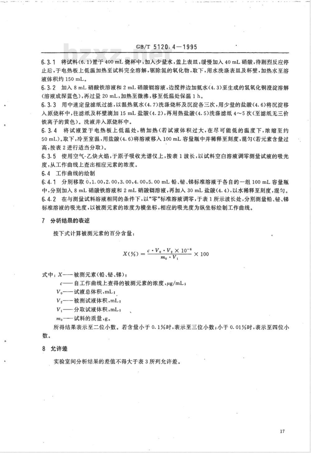 式中:X一被测元素(铅、铋、锑):一自工作曲线上查得的被测元素的浓度,μg/mL;V。试液总体积,mL;