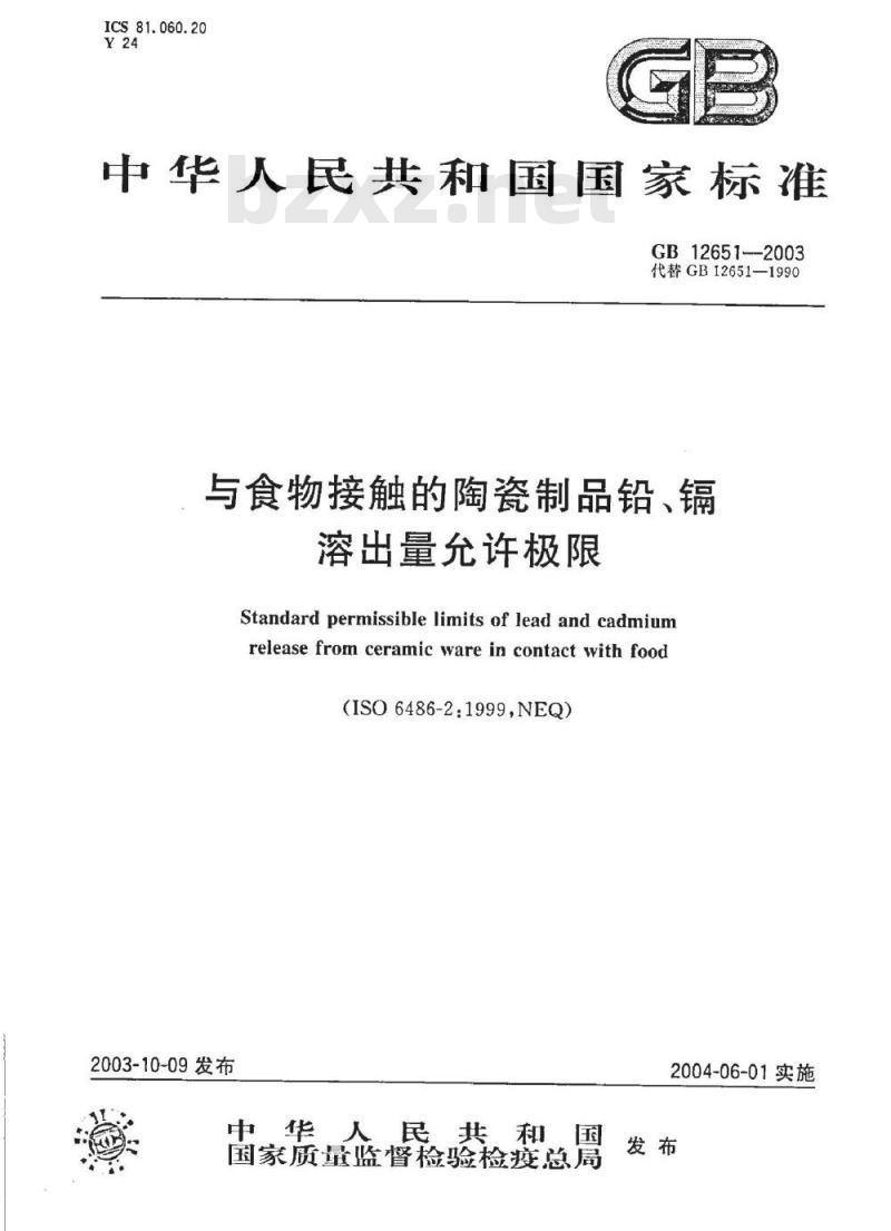 与食物接触的陶瓷制品铅、镉溶出量允许极限本标准规定了与食物接触的陶瓷制品铅、铝溶出量允许值。GB12651—2003