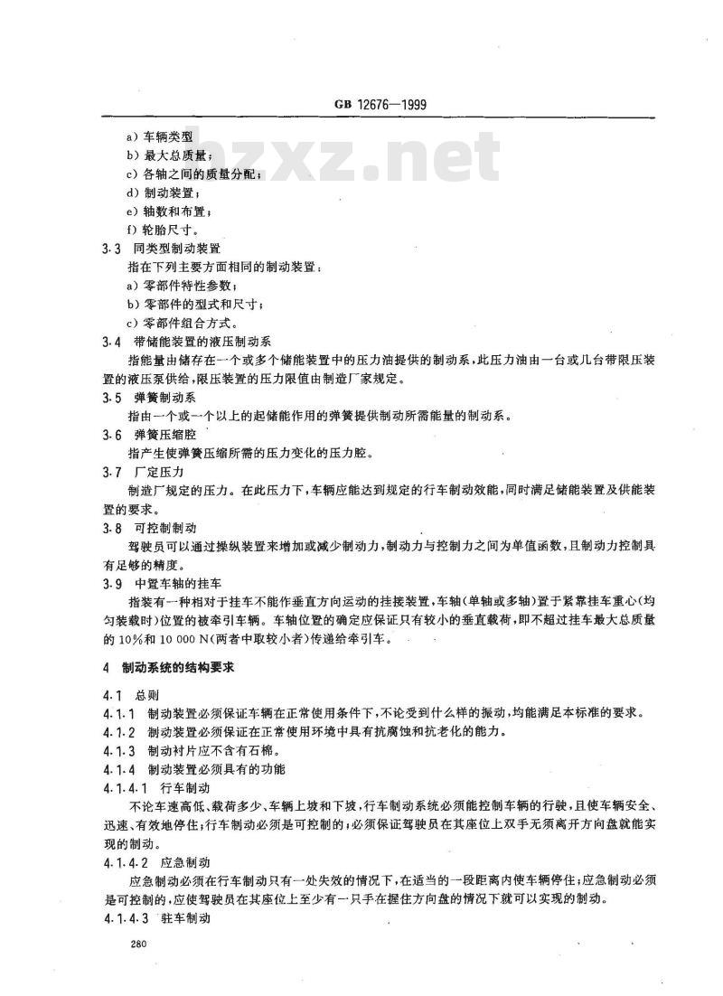 ③第4.2.12.1条有关液面报警装置的要求。④第4.2.12.2条有关液压制动系必须安装失效报警装置。③第4.2.12.3条有关制动液类型的标志的要求。第4.2.13条有关储能装置中安装报警装置。③第4.4条有关弹簧制动系的要求。第5.1.5条有关车辆状况应符合附录A的要求。第5.2.1.2条有关发动机接合的0型试验性能要求。@第5.2.4条和第5.2.5条有关行车制动系I型和IA型试验的要求。3本标准实施之日起,下列条款48个月后实施:①有关应急制动系结构和性能的要求(第4.1.4.2条,第4.2.2.5条,第4.2.2.6a条,第4.2.2.6b条,第4.2.5.2条,第4.2.13条中有关报警压力的要求、第4.2.15条,第5.2.6条,第5.5条)。②有关挂车制动系结构和性能的要求(第4.3.10条、第5.3条,但第5.3.4条除外,第5.4.4条)。第4.2.11.1条和4.3.8.1条有关行车制动器的磨损应能自动调整的要求。④第4.2.20条和第4.3.13条有关车辆必须安装防抱死装置的要求。③第4.2.18条,第4.3.12条,第5.4.2.3条。③第4.1.3条有关制动衬片不含石棉的要求。?第5.2.7.6条有关驻车制动系动态试验的要求。4本标准实施之日起,对Nz类气制动汽车,上述第1条和第2条各项要求均为48个月后实施,对N1、N2类液压制动汽车,第5.1.5条48个月后实施。本标准实施之日起,同时代替GB/T12676--90。本标准的附录 A、附录 B、附录 C 均为标准的附录。本标准由国家机械工业局提出。277