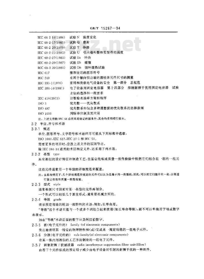 加在“等级”术语后面的数字应是阿拉伯数字。2.2.5族(电子元件的)fetnily(ol electronic component)突出地表明某:-特定的物理特性和(或)完成某规定功能的一组电子元件。2.2.6分族(电子元件的)sub-family(ofelectroniccomponents)在某一族内用似的工艺方法制造的一组电了件。2.2.7抑制射赖扰滤波器radio intcrference suppressionfilter unit(filter)由若下个元件组成的预定用于减少由电子设备所引起的射频干扰的一种组件。GB/T 15287—94