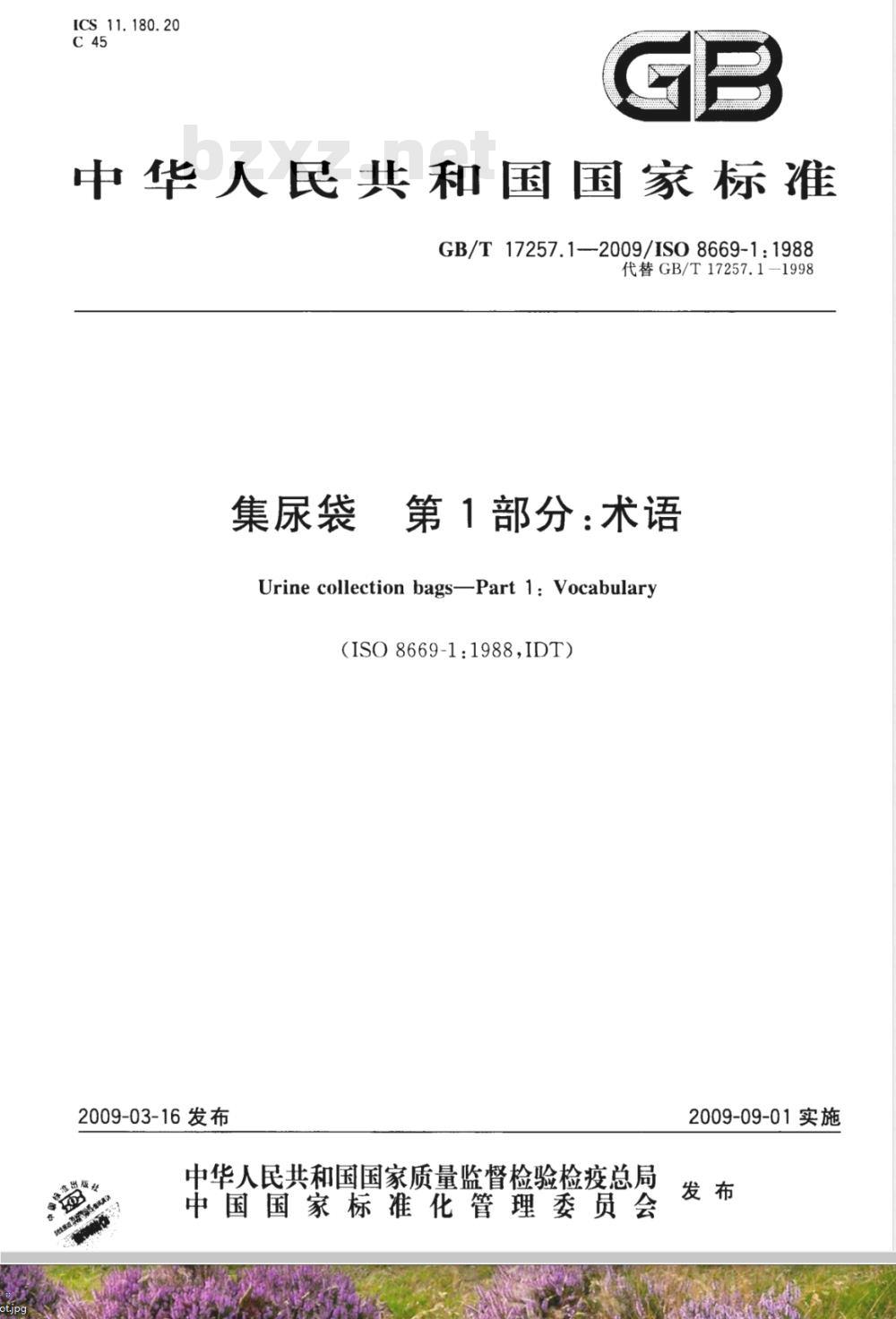 GB/T 17257的本部分定义的术语仅适用于集尿袋的国家标准,相关医学术语不予定义。本部分的术语无论单独或联合使用,都不作为规定或推荐某种产品的特殊设计、式样和规格。 GB/T 17257.1-2009 集尿袋 第1部分:术语 GB/T17257.1-2009