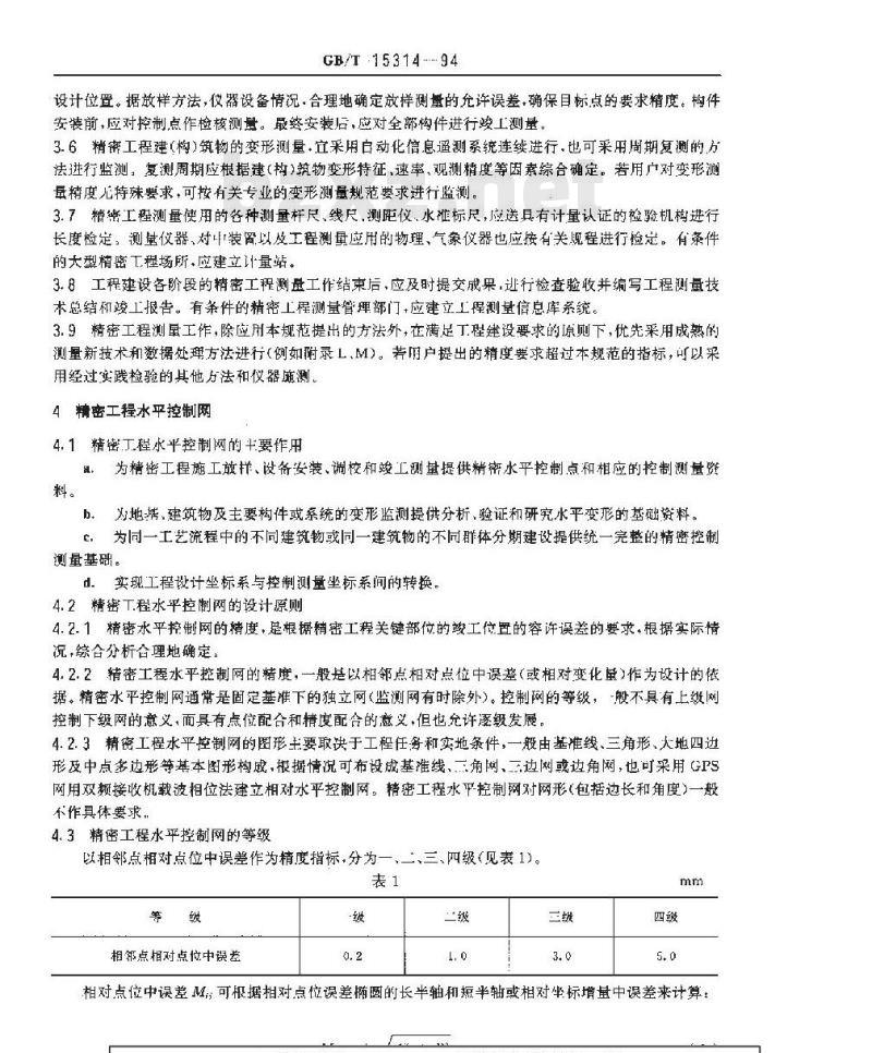 本标准规定了精密工程测量及其控制网的布设原则、等级、作业要求和数据处理方法。本标准适用于各类工程的勘察设计、施工放样、安装调试、变形监测诸阶段的精密测量工作。在其他领域应用时,其原则也可参照执行。 GB/T 15314-1994 精密工程测量规范 GB/T15314-1994