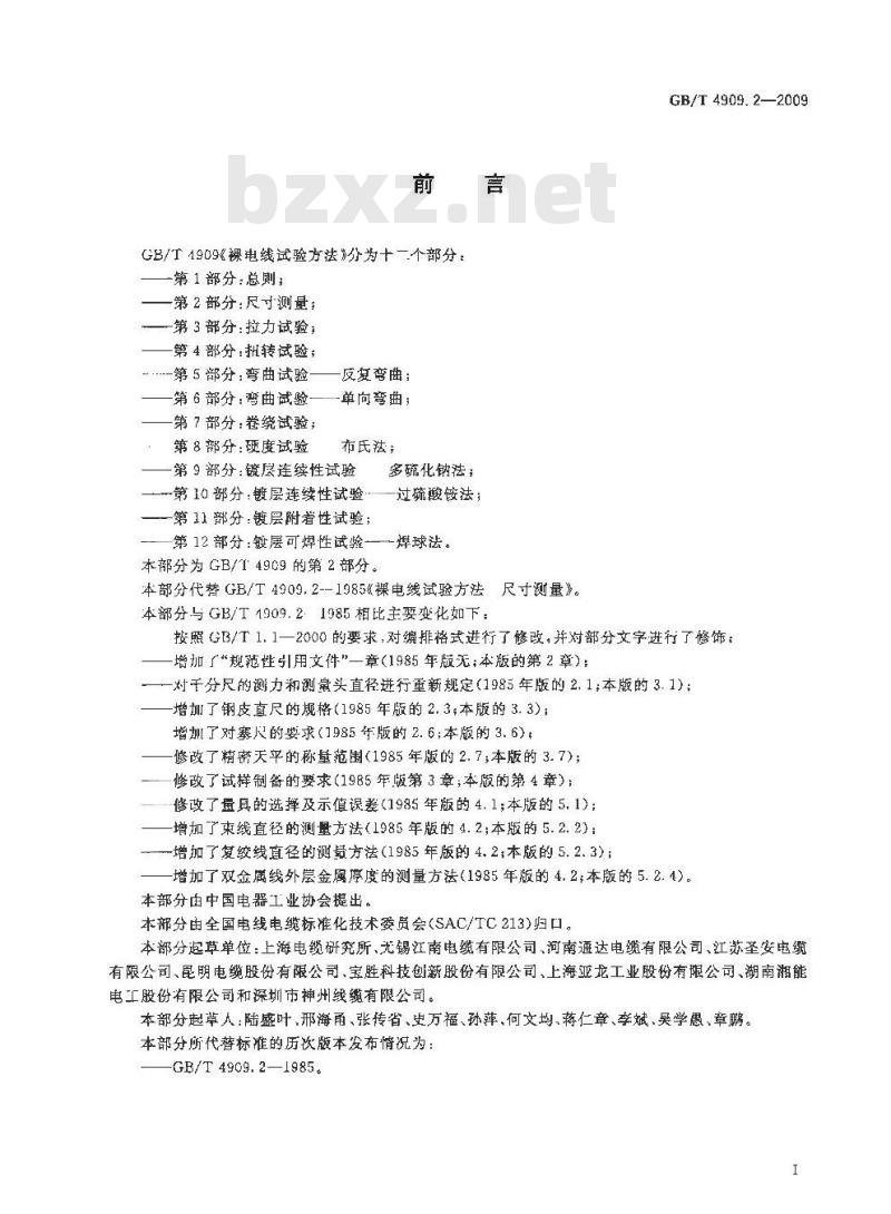 按照GB/T1.1一2000的要求,对编排格式进行了修改,并对部分文字进行了修饰;增加了“规范性引用文件\一章(1985年版无;本版的第2章)一对千分尺的测力和测毫头直径进行重新规定(1985年版的2.1;本版的3.1);增加了钢皮直尺的舰格(1985年版的2.3;本版的3.3):增加了对塞尺的要求(1985年版的2.6;本版的3.6)修改了精密天平的称量范围(1985年版的2.7;本版的3.7);一修改了试样制备的要求(1985年版第3章;本版的第4章);修改了量具的选择及示值误差(1985年版的4.1;本版的5.1);-增加了束线直径的测量方法(1985年版的4.2;本版的5.2.2):一增加了复绞线直径的测最方法(1985年版的4.2,本版的5.2.3);增加了双金属线外层金属厚度的测量方法(1985年版的4.2;本版的5.2.4)。本部分由中国电器工业协会提出。本部分由全国电线电缆标准化技术委员会(SAC/TC213)归口。本部分起草单位:上海电缆研究所、光锡江南电缆有限公司、河南通达电缆有限公司、江苏圣安电缆有限公司、昆明电缆股份有限公司,宝胜科技创新股份有限公司、上海亚龙工业股份有限公司、湖南湘能电工股份有限公司和深圳市神州线缆有限公司。本部分起草人:陆盛叶,邢海甬、张传省、史万福、孙萍、何文均.蒋仁章、李斌、吴学愚,章鹏。本部分所代替标准的历次版本发布情况为:GB/T 4909.2—1985.
